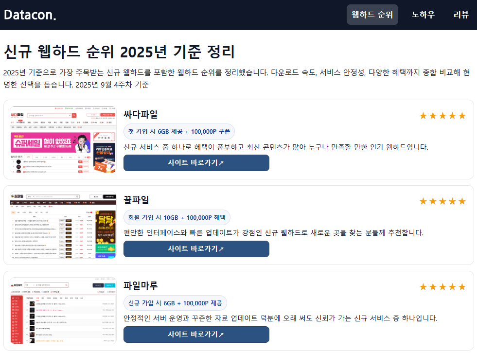 데이터콘은 웹하드와 관련된 정보를 한눈에 정리하고 소개하는 공간이에요. 단순히 순위를 나열하는 것에 그치지 않고, 실제 이용에 도움이 될 만한 노하우와 프로그램·콘텐츠 리뷰까지 다루고 있습니다. 웹하드를 처음 접하는 분들도, 오랫동안 사용해온 분들도 모두 참고할 수 있도록 구성되어 있습니다.