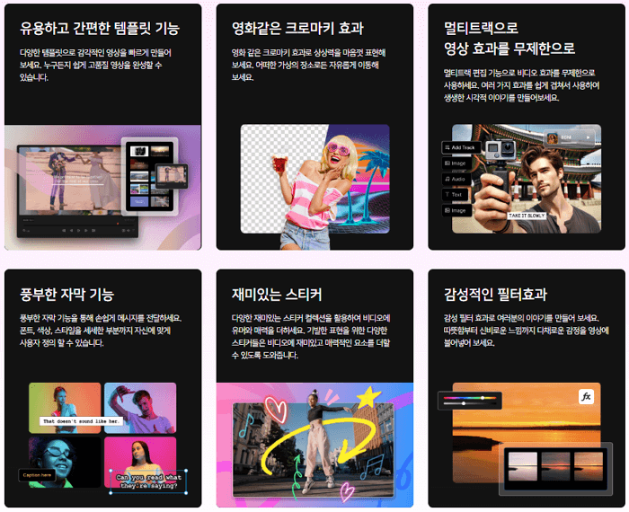 필터·전환·오버레이·스티커 등 2,000+ 무료 효과로 장면의 분위기를 자유롭게 바꿔 보세요. 여행·행사·브이로그 등 상황별 추천 조합이 제공되어 초보자도 큐레이션된 효과를 쉽게 선택할 수 있습니다. 여기에 최대 1,000개의 배경음/효과음을 더해 리듬감과 몰입도를 높일 수 있어요.